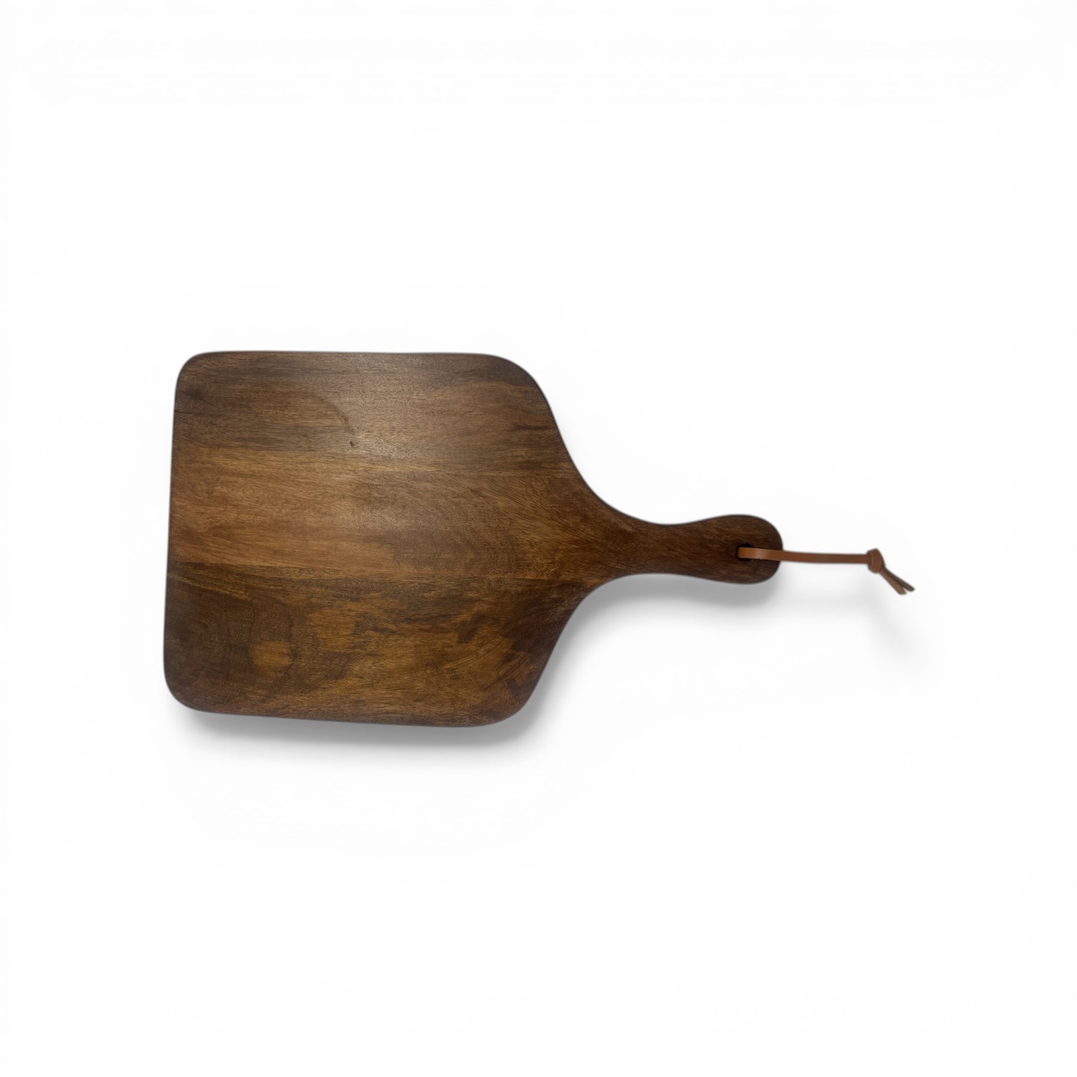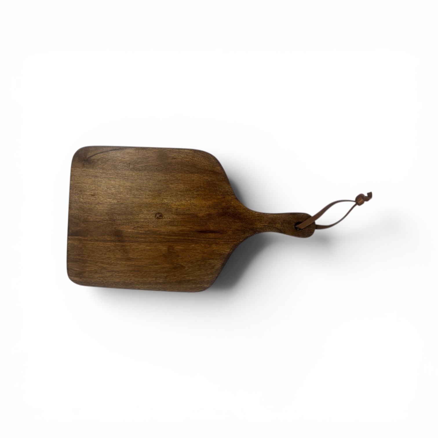 Crafted from durable mango wood with a rich walnut finish, this classic paddle-style cutting board combines everyday function with elevated presentation. The smooth, rounded shape and extended handle with leather tie make it easy to use, serve, and display.