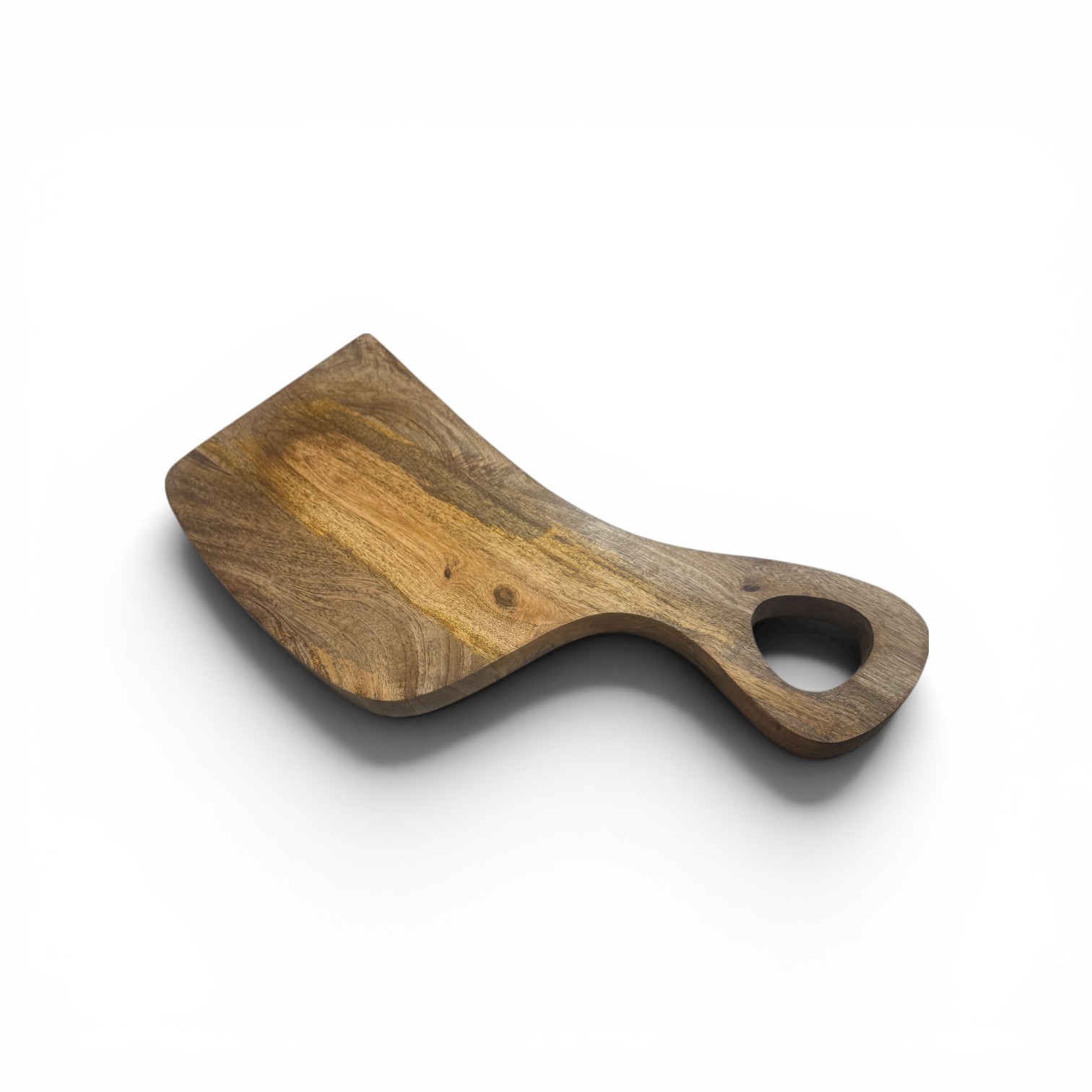 Bring a unique, organic touch to your kitchen with this sculpted mango wood cutting board. Featuring a gently curved silhouette and an integrated handle with a circular cut-out, this board combines artistic design with everyday functionality.
