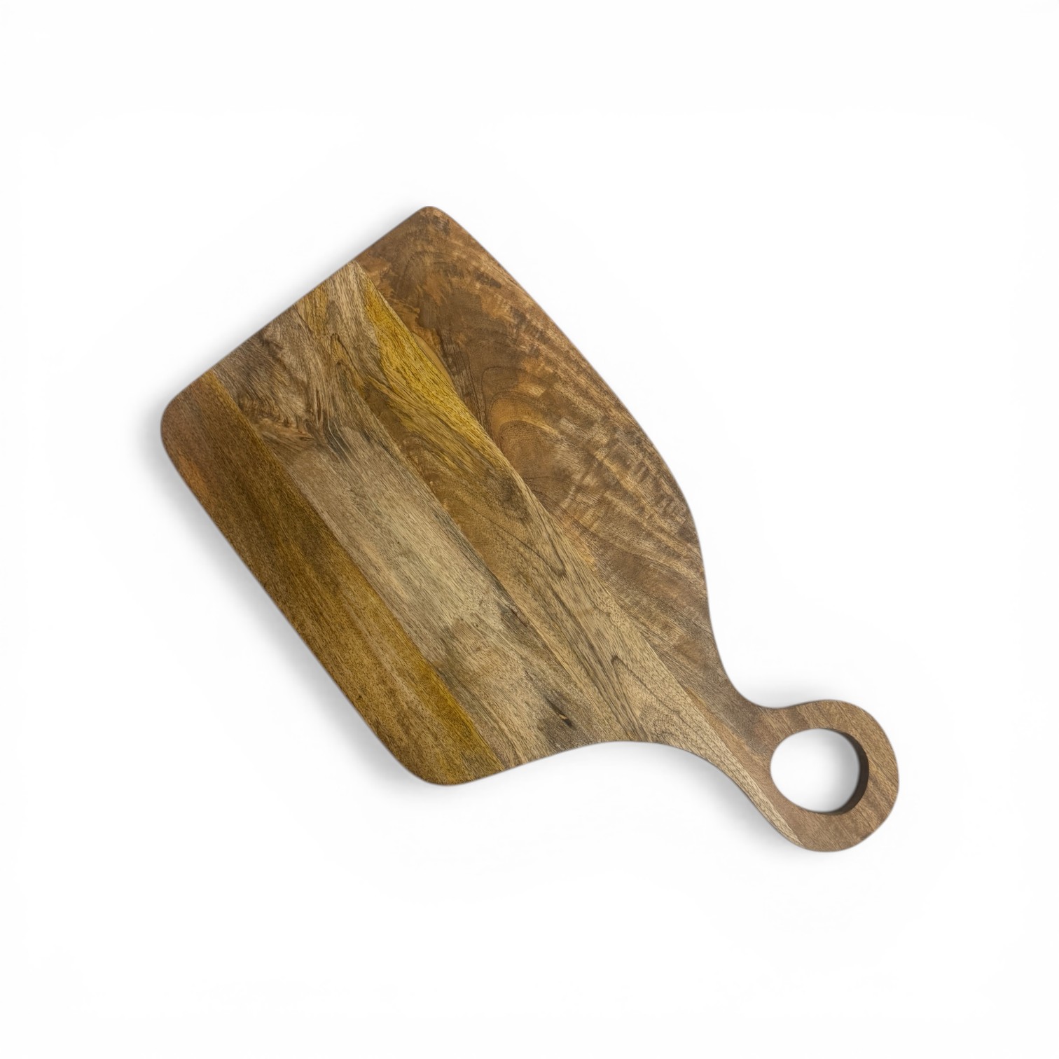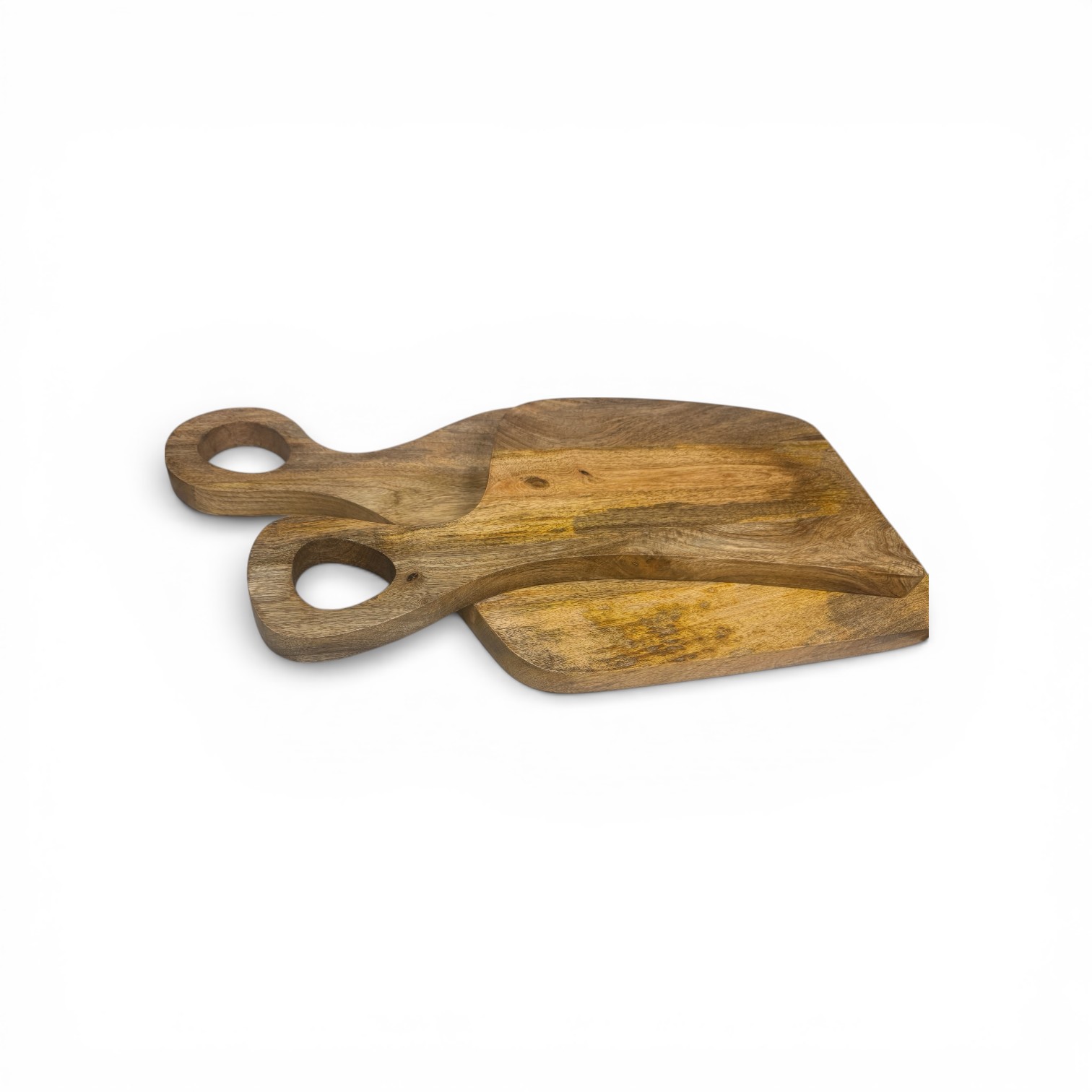 Perfect for food prep or serving charcuterie, its distinctive shape adds visual interest to any table or kitchen display. Each piece showcases natural variations in mango wood grain, making every board one of a kind.